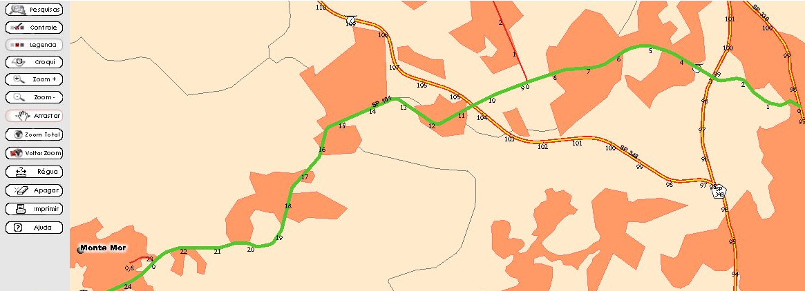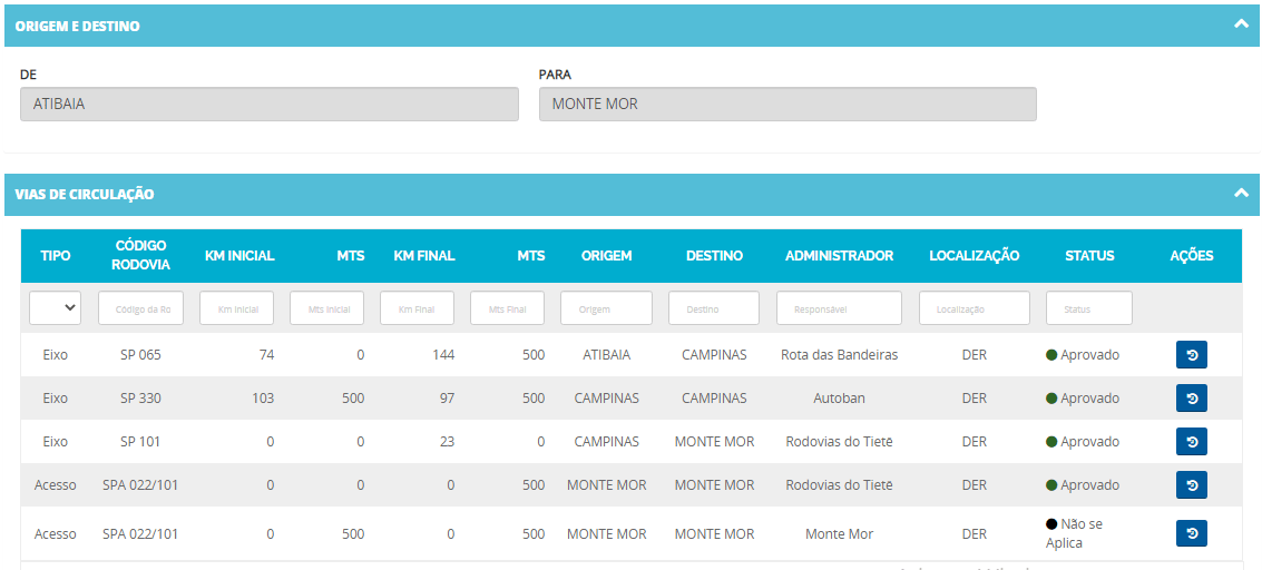 3 - Descarte os trechos de vias municipais e federais e clique em ver no mapa para identificar os km de entrada e de saida nas rodovias estaduais: