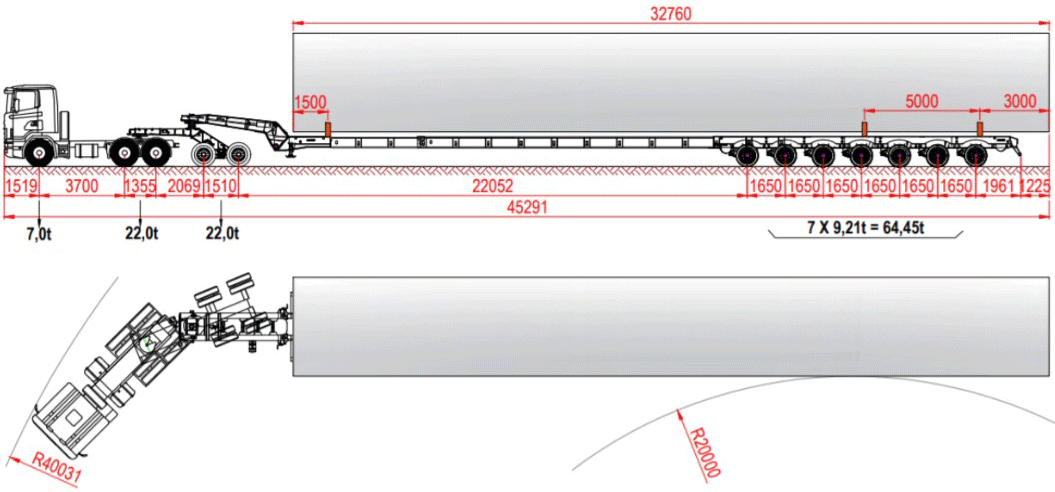 b) sempre que possível, tenha em mãos o desenho técnico do conjunto transportador e a tecnologia de transportes utilizada, tipo de suspensão, eixos direcionais ou não direcionais. A carreta abaixo com 7 eixos e apenas 3 deles auto-direcionais, seguramente terá muitas dificuldades em rodovias com raios de curvatura apertados, em especial em rodovias de pistas simples: