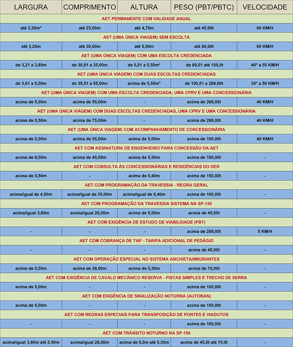 c) não se esqueça de que os custos com taxas e tarifas para trânsito de cargas excedentes aumentam proporcionalmente com o aumento do peso e das dimensões do conjunto transportador. Vide quadro abaixo, válido para o DER-SP: