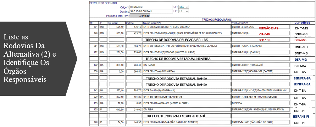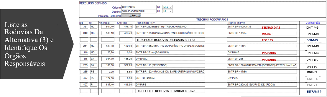 3- Liste as rodovias do percurso (federais, estaduais e municipais), identificando precisamente os km iniciais e finais dos trechos a serem percorridos;