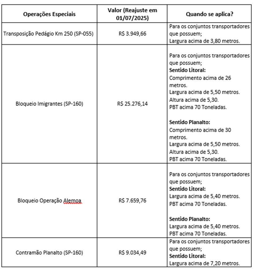 Exigências de concessionárias. As exigências podem variar. Na Ecovias, por exemplo, os limites para programação de travessia e obrigatoriedade de trânsito noturno são inferiores aos das demais concessionárias, confira aqui.