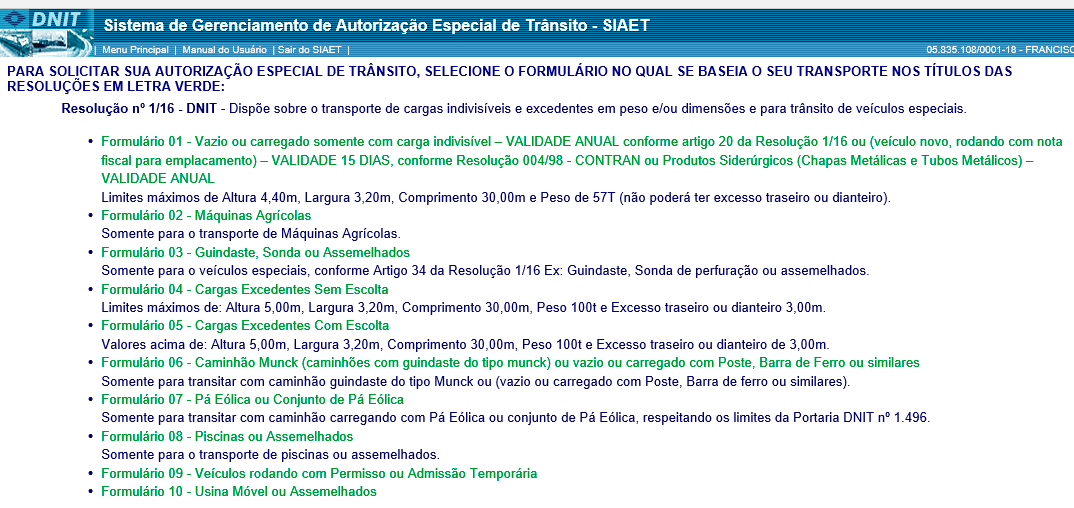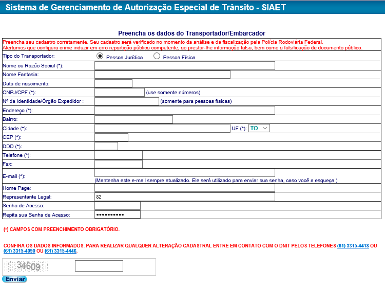 1 - Cadastre sua empresa no SIAET, clicando em http://siaet.dnit.gov.br e preenchendo o formulário abaixo: