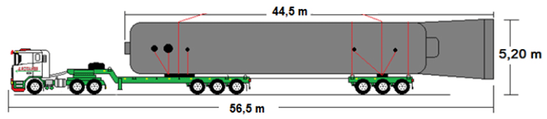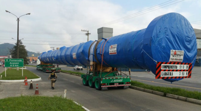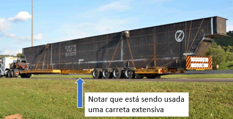 O excesso longitudinal traseiro superior a 1,0m de comprimento e limitado a 3,0m, será admitido nos casos, em que fique comprovada a inexistência de veículo adequado ou adequável ao transporte, como no caso abaixo: notar que, apesar do uso de uma prancha extensiva, não foi possível eliminar o excesso longitudinal traseiro.