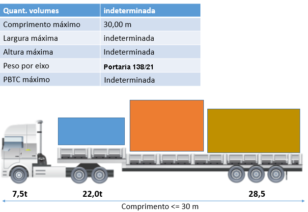 De acordo com o item 3.4.2. da Portaria 138/21 do DER-SP, poderá ser fornecida AET para o transporte de carga composta de até duas unidades de carga indivisível no mesmo veículo, ou combinação de veículos, respeitados os pesos fixados nesta Norma e o comprimento de no máximo 30,00 m, do conjunto transportador;