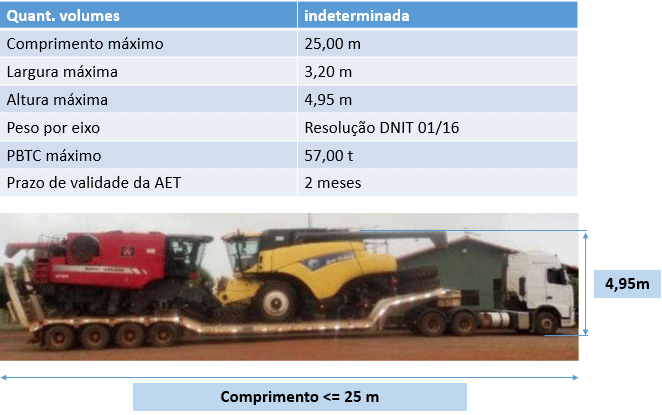 O DNIT, com base na Resolução 02/14 de 27 de fevereiro de 2014 criou uma regra especial para quem transporta máquinas agrícolas com altura final do conjunto transportador acima de 4,40 e até 4,95.