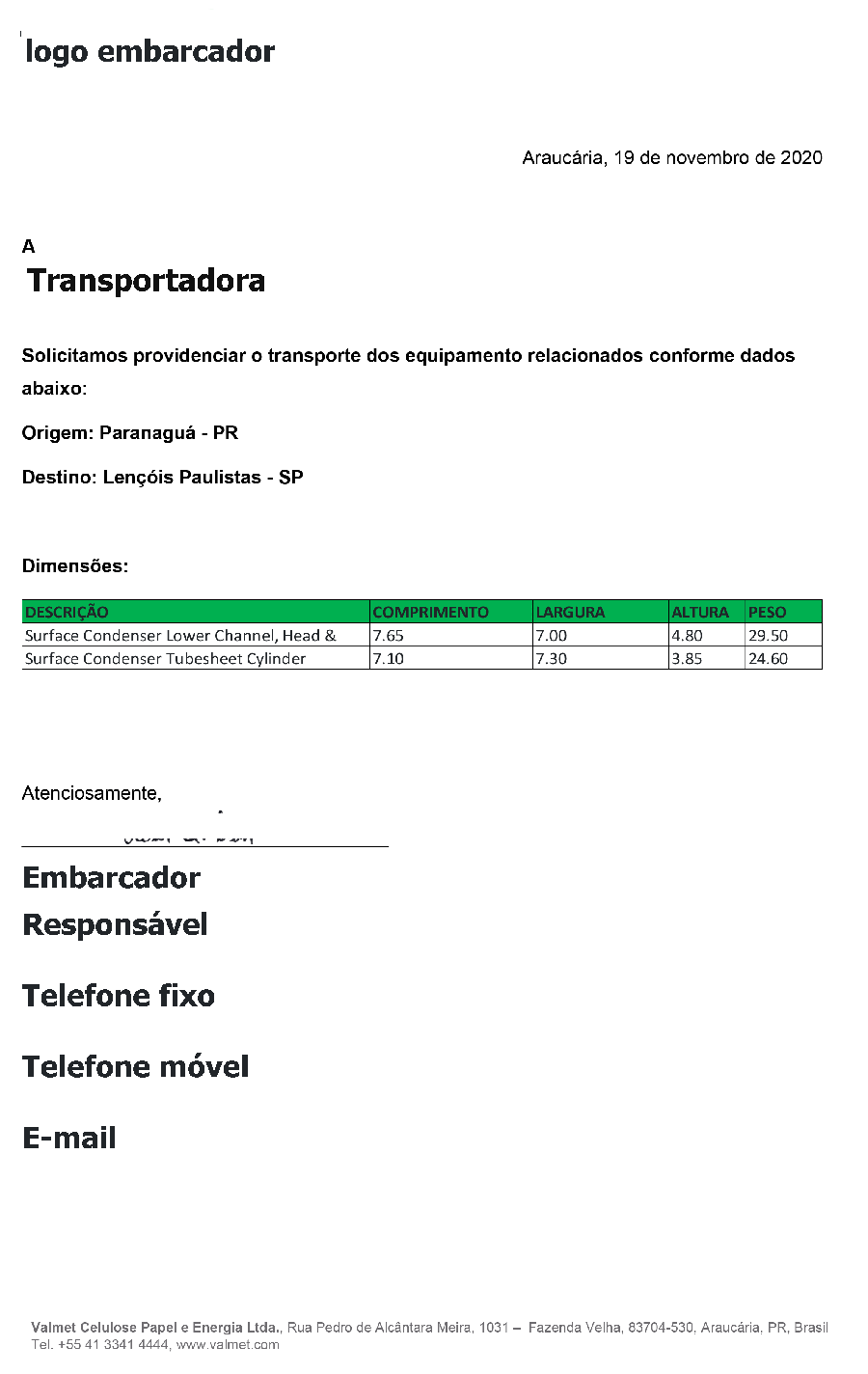 Deve ser feita em papel timbrado da empresa, contendo nome do contratante do frete, responsável pelas informações e canais de contato.