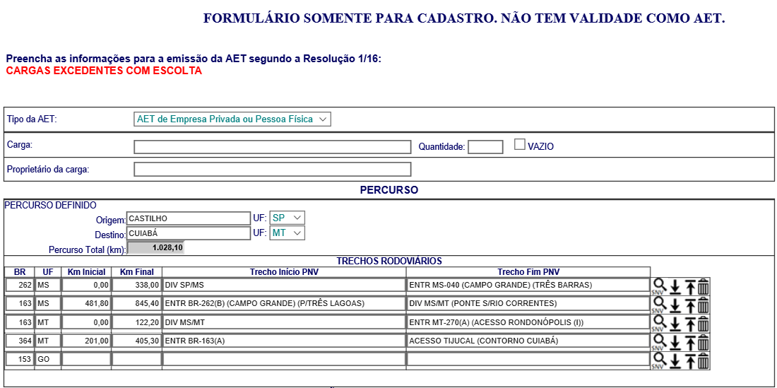 Início / Conteúdo Técnico / Requisitos para obtenção da AET / Formulário do DNIT para obtenção de AET com escolta Requisitos para obtenção da AET Formulário do DNIT para obtenção de AET com escolta Atualizado em 27/12/2025 Voltar para Requisitos para obtenção da AET