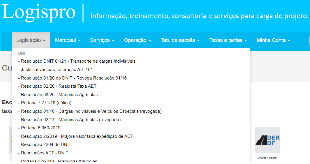 Passe o mouse na aba Legislação da Plataforma Logispro e tenha acesso rapidamente a todas as legislações (resoluções, portarias, leis, etc) que regulamentam o trânsito de veículos de transporte de cargas indivisíveis no Brasil. Vide abaixo:
