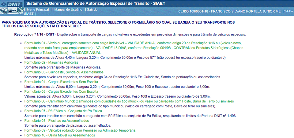 5. Na página abaixo você vai ter que escolher o formulário de acordo com as características da carga ou cargas a serem transportadas: