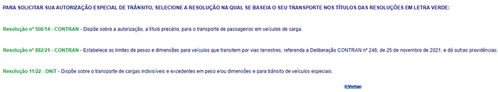 4. Para começar a requerer uma AET, ao escolher a opção AET, você será enviado para a página abaixo, na qual você terá que escolher a resolução do seu interesse. Se se tratar de carga indivisível e veículos especiais, dentre eles, os guindastes, etc, selecione a opção Resolução 01/16 do DNIT: