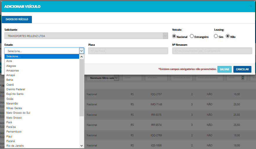 # passo 6 – Na tela acima, ao selecionar um TRANSPORTADOR, vai aparecer a tela abaixo.É com ela que você vai SELECIONAR os veículos previamente cadastrados, começando com a UNIDADE TRATORA. Depois as demais unidades