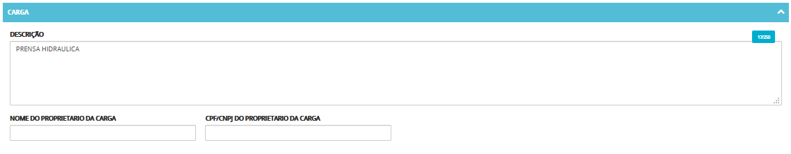 # passo 8 – Informe qual é a carga que vai ser transportada, nome do proprietário e CNPJ