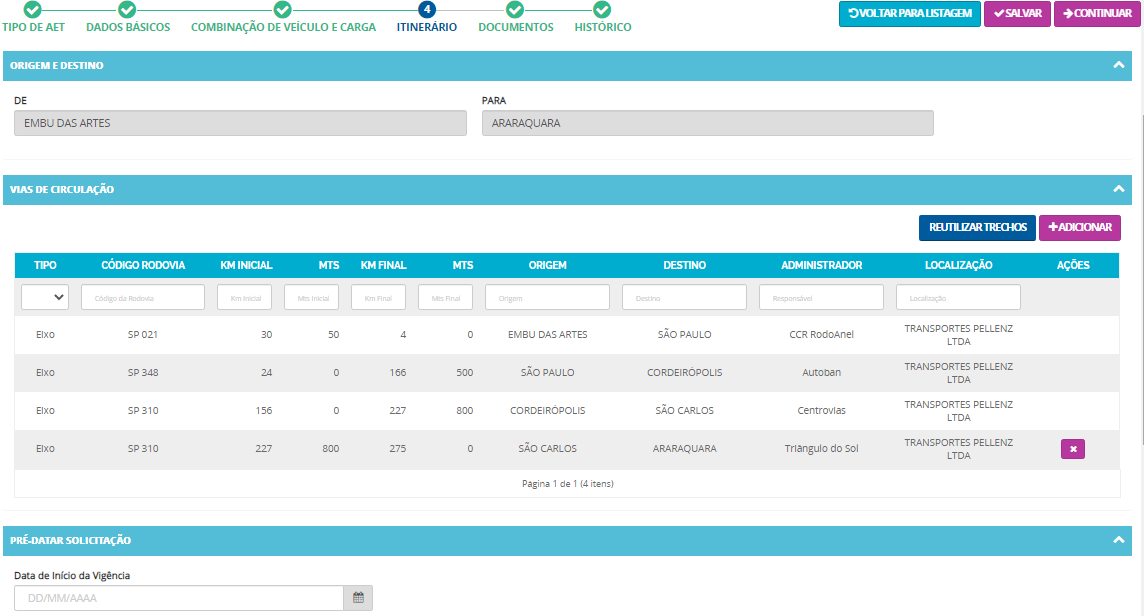 # passo 10 – Informe no formulário abaixo origem, destino, rodovias do percurso, informando km inicial e km final. Para ajudar nessa etapa, use a ferramenta WEB ROTAS DO DER