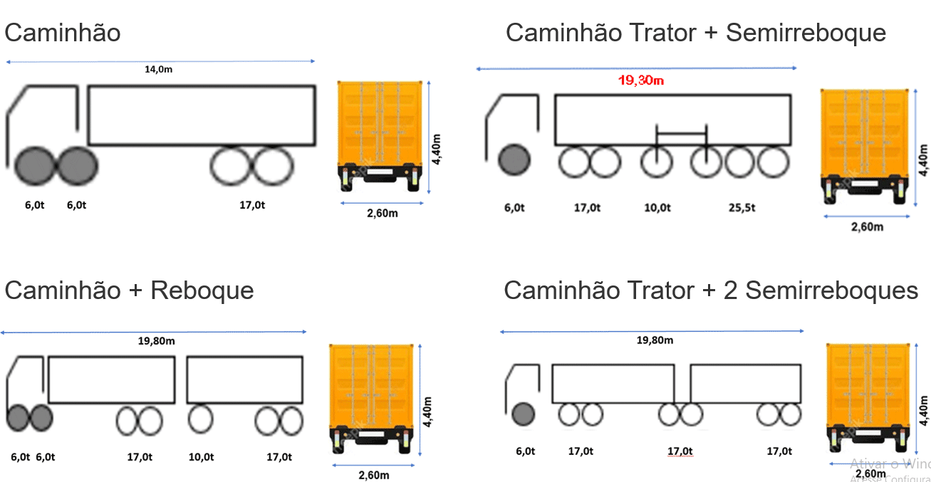 De acordo com a Resolução SENATRAN 882/21 e com a Portaria SENATRAN 268/22, os pesos por eixo e conjunto de eixos assim como as dimensões máximas de largura, comprimento e altura dos veículos para transporte de cargas no Brasil, são as abaixo. ACIMA DESSES LIMITES, OBSERVADA REGULAMENTAÇÃO PERTINENTE, O TRÂNSITO SÓ SERÁ PERMITIDO MEDIANTE PRÉVIA AUTORIZAÇÃO ESPECIAL DE TRÂNSITO.