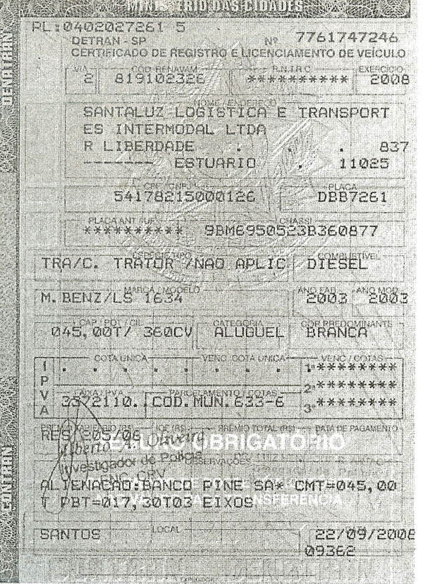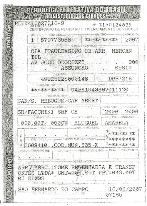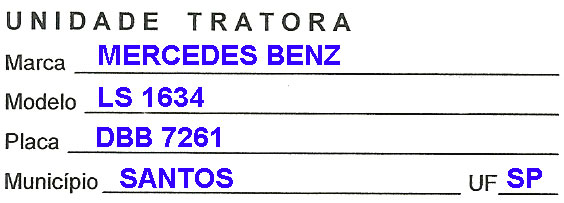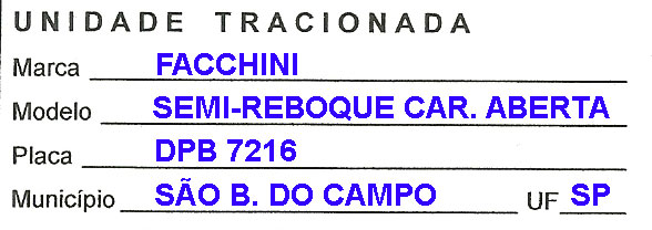 Este campo deve ser preenchido com os dados referentes à unidade tracionada, ou seja aos reboques e semi-reboques, tais como: marca, modelo, placas, município e UF, podendo quando necessário ser utilizado o verso do requerimento. Essas informações devem ser obtidas diretamente do Certificado de Registro e Licenciamento do Veículo, vide abaixo:
