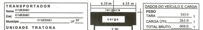 Este campo contêm uma figura esquemática que deve ser preenchida, marcando-se com um "X" os veículos usados no transporte, a quantidade de eixos, a distância entre os eixos e peso por eixo ou conjunto de eixos.