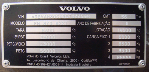 TARA - peso próprio do veículo, acrescido dos pesos da carroçaria e equipamento, do combustível - pelo menos 90% da capacidade do(s) tanque(s), das ferramentas e dos acessórios, da roda sobressalente, do extintor de incêndio e do fluido de arrefecimento, expresso em quilogramas. Tara de caminhão Volvo VM 310