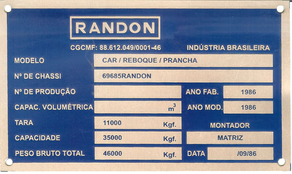 Este campo deve ser preenchido com a tara da combinação de veículos escolhida para a execução do transporte, que deve ser levantada preferencialmente junto às plaquetas de inscrição, conforme o que determina a resolução nº 290, de 29 de agosto de 2008, ou no catálogo dos veículos fornecido pelo fabricante, vide abaixo: