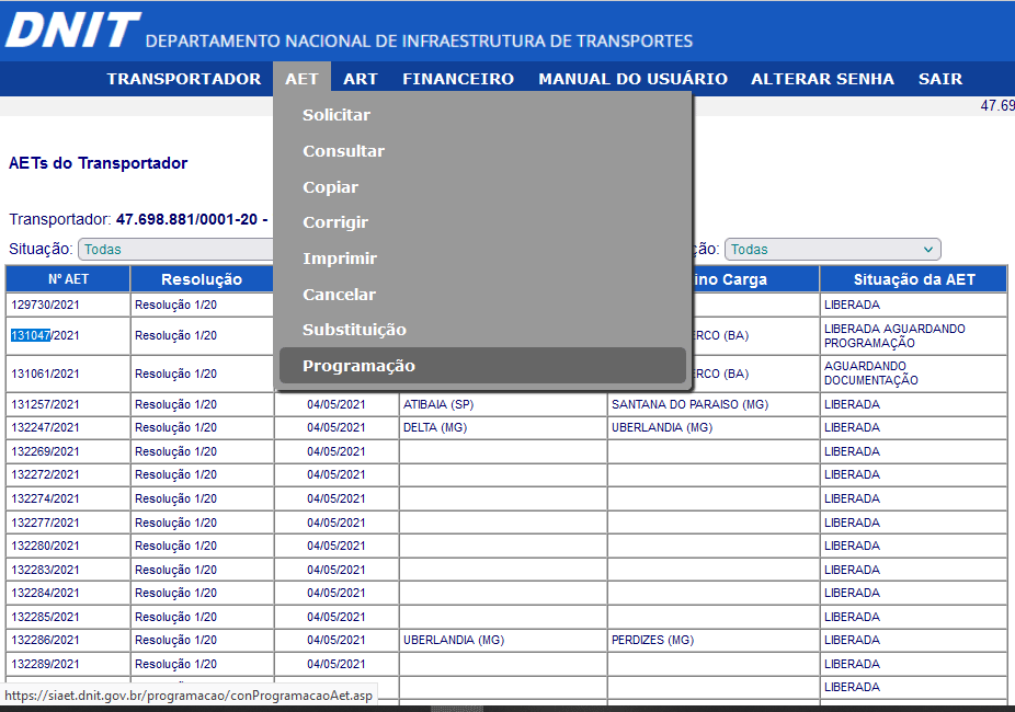 3.0. Solicitação das AET's