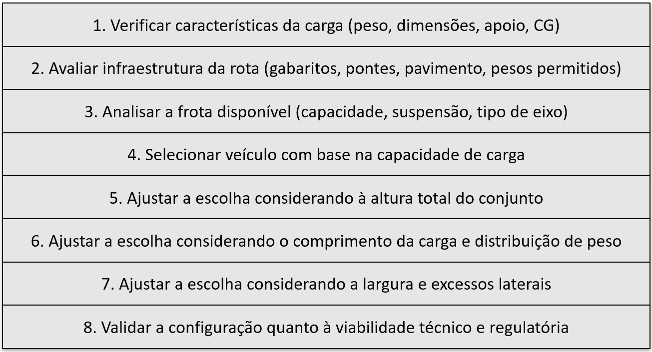 Selecione veículos ou combinações capazes de suportar o peso total da carga, respeitando limites legais e técnicos.
