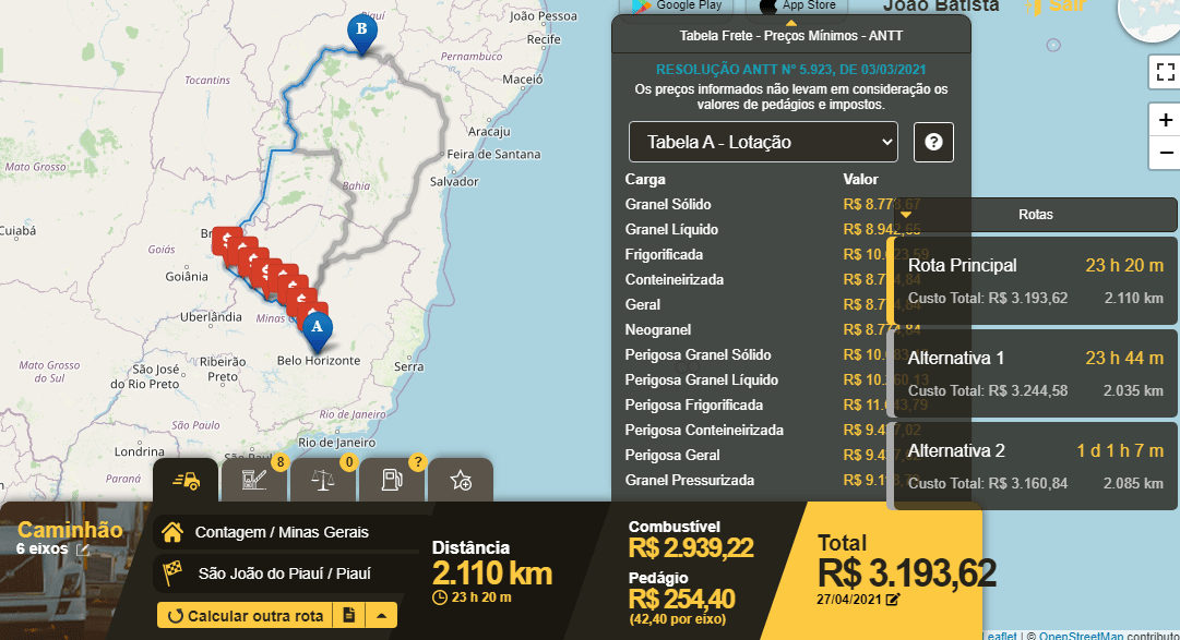Alternativa de rota 1: confira a distância, custos com Diesel e Pedágio