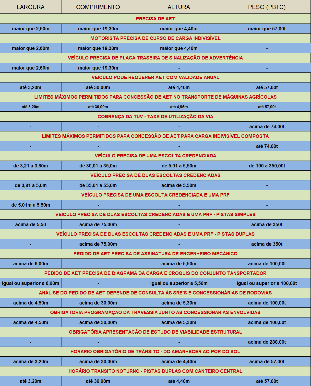 Regra básica: quanto menor o PBT/PBTC e as dimensões finais do conjunto transportador (veículo + carga), menor os custos, a quantidade das exigências para obtenção de AETs e para operacionalização do transporte. Vide quadro abaixo: