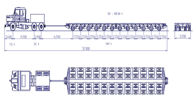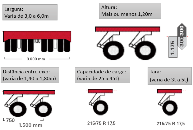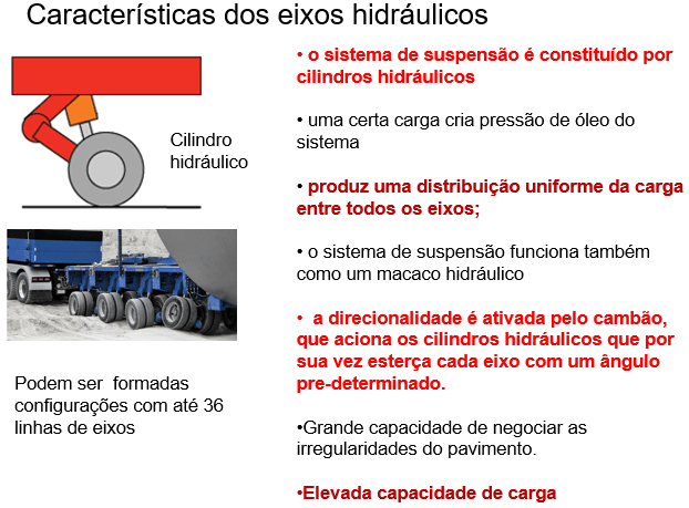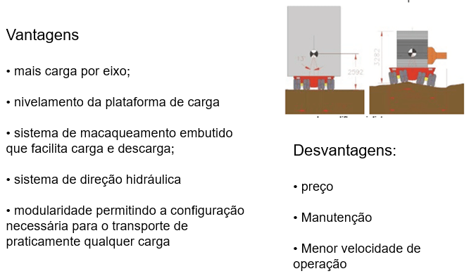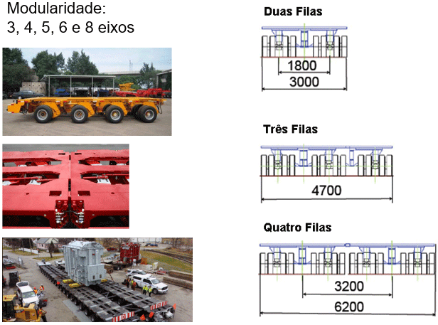 Conjuntos modulares, variando de 3 a 8 linhas de eixos, para transporte de cargas com pesos e dimensões excedentes, com as seguintes características: